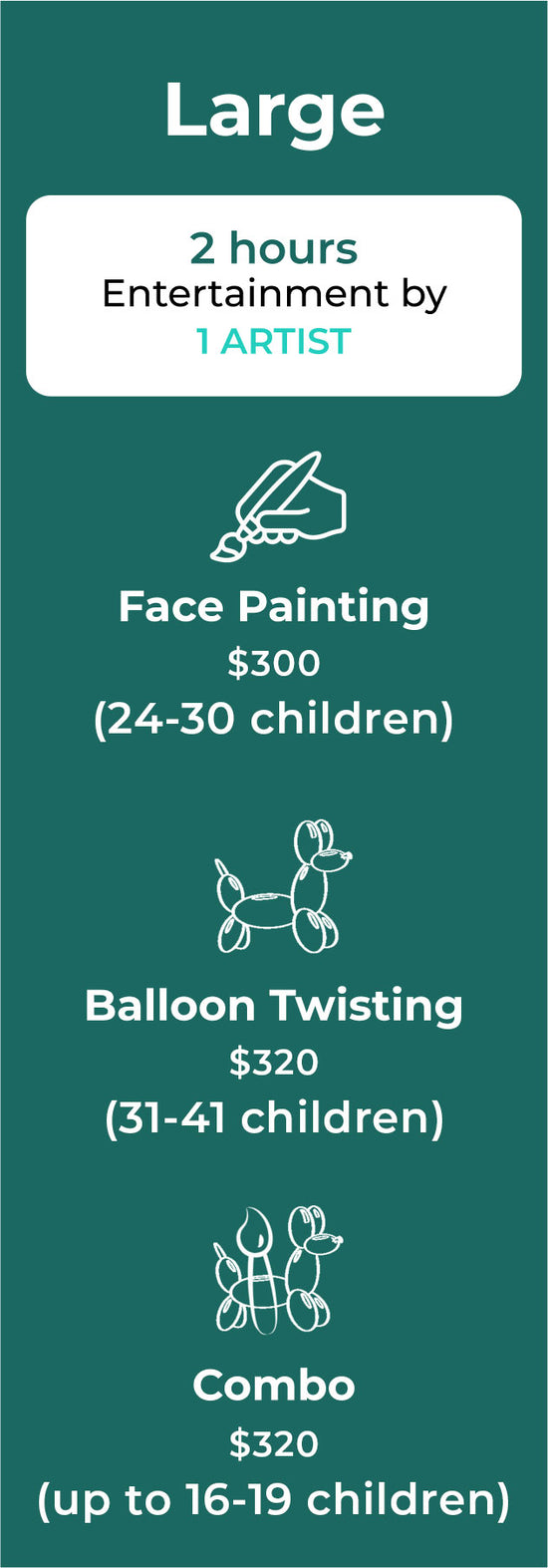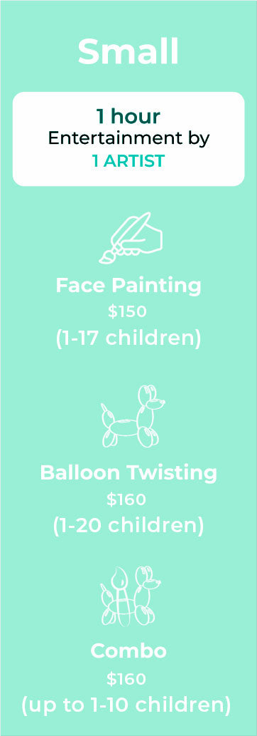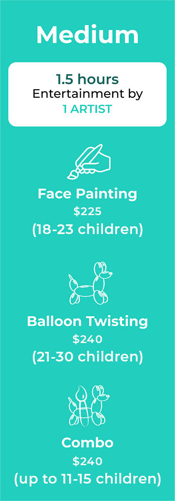 3. Two artists at the same time can entertain large parties. If you are expecting more than 30 children, ask for our special quote.